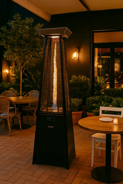 Este calefactor combina funcionalidad y diseño para transformar cualquier espacio exterior. Su elegante estructura vertical y llama visible crean un ambiente cálido y visualmente atractivo, ideal para terrazas, patios, restaurantes o eventos al aire libre.